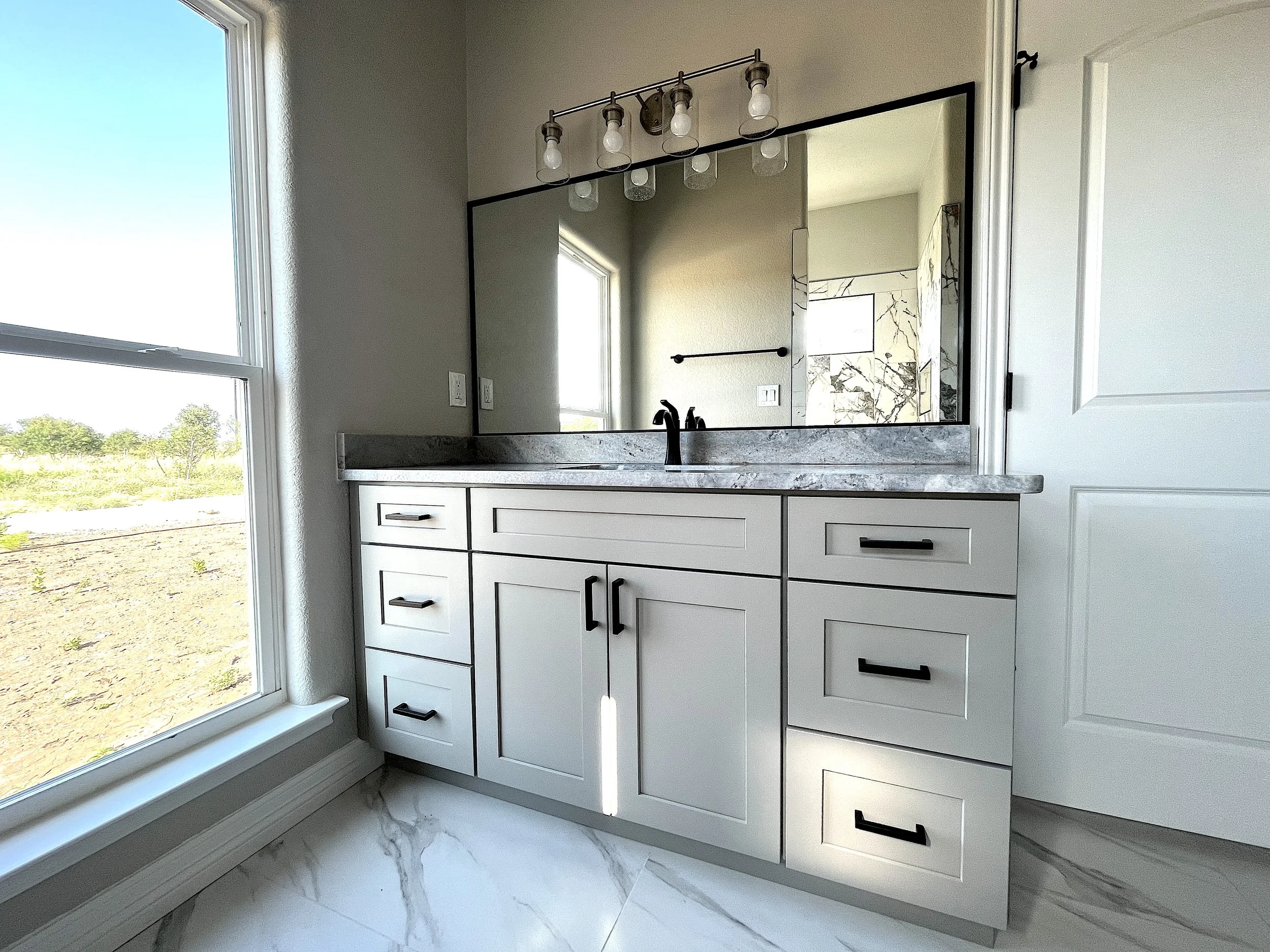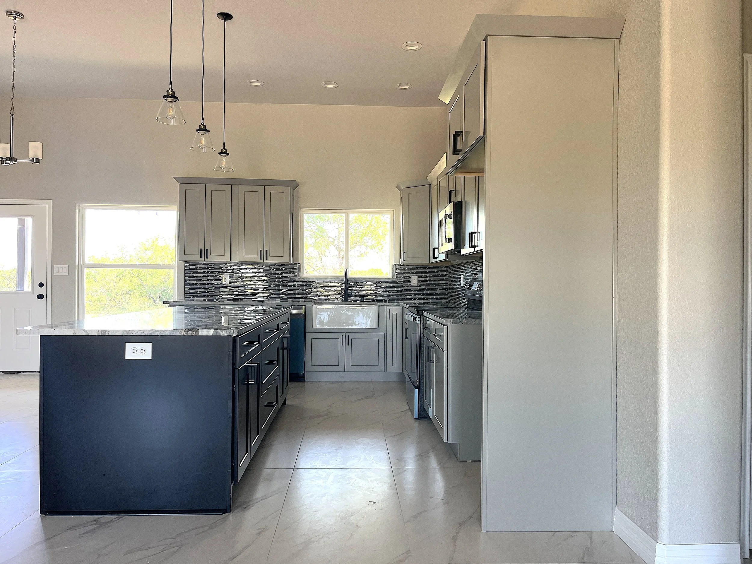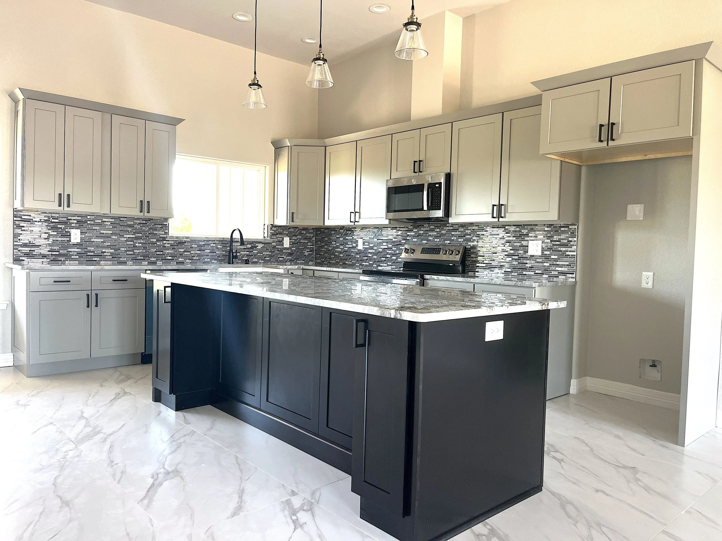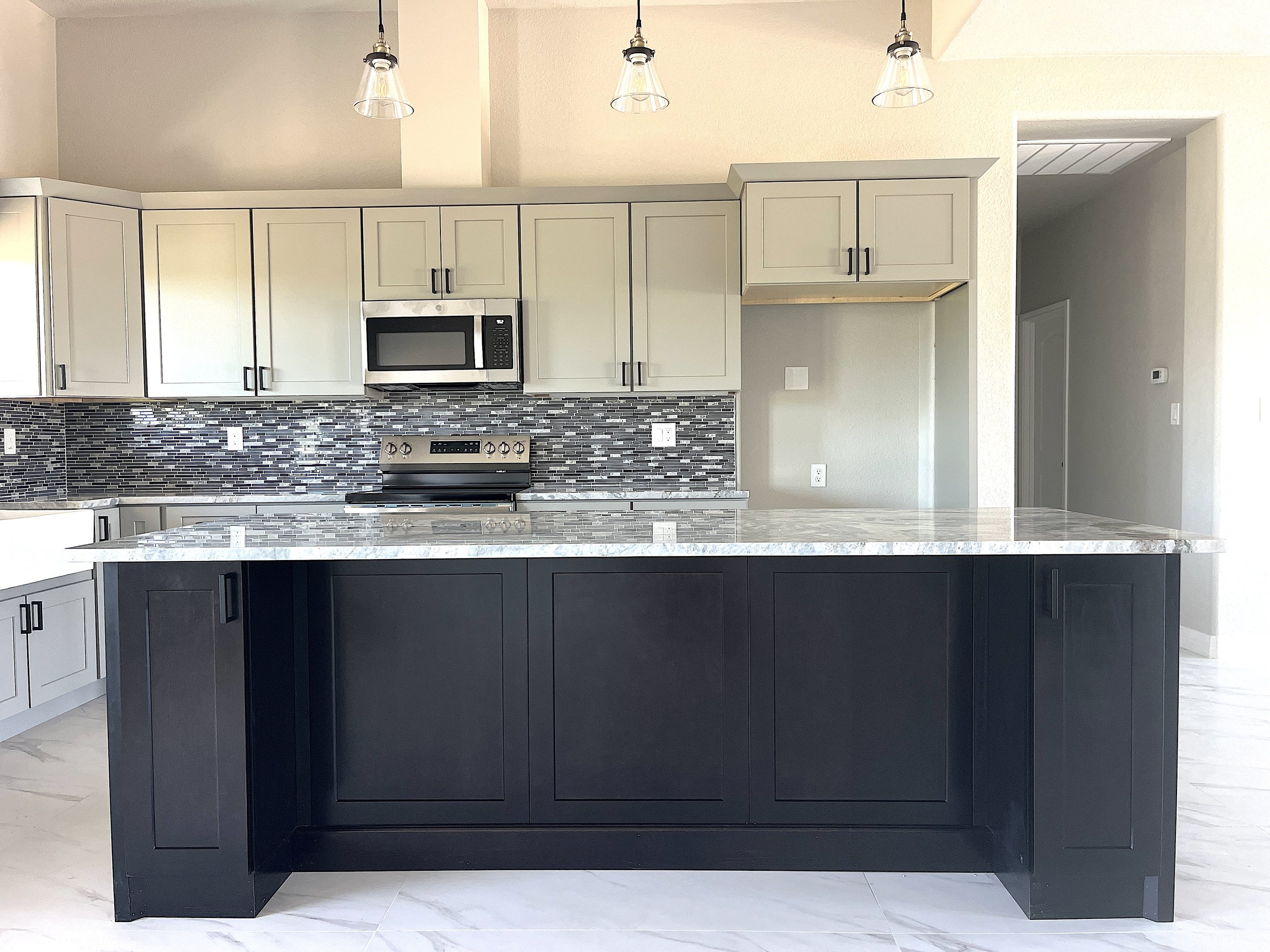 Northpoint Cabinetry Pre Finished CabinetsCatalina Line with Pebble Grey PaintIsland: Espresso Brown StainShaker style crown mounding and doors