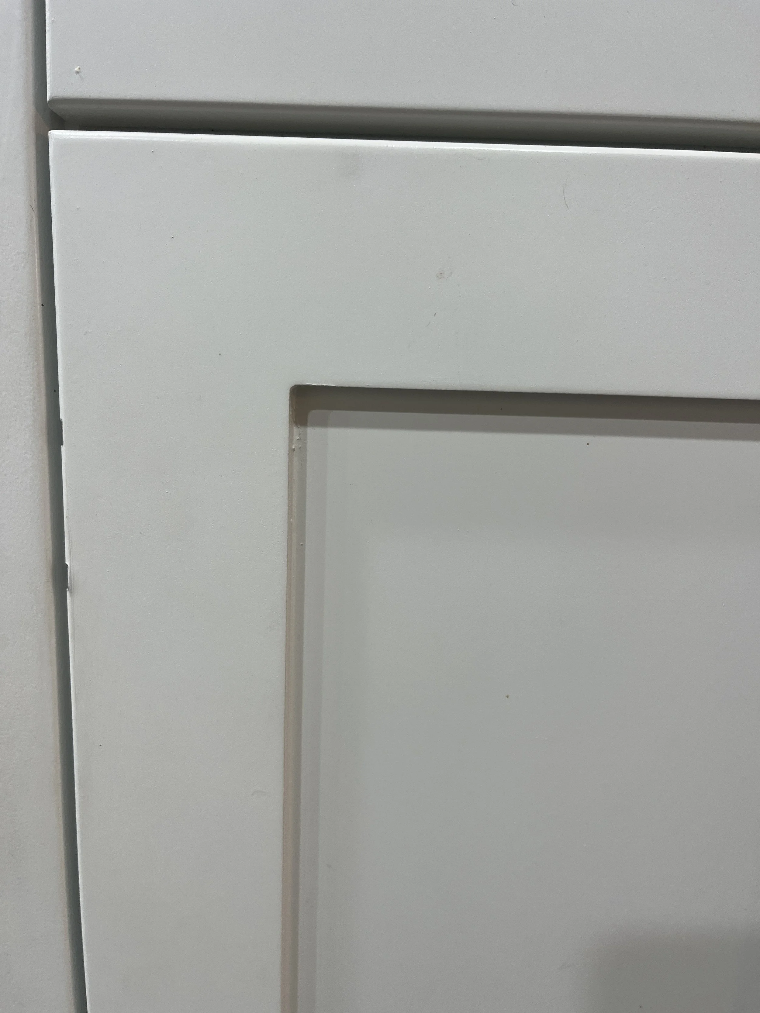 To assemble these doors, we simply glue the panel in the back of the door and nail it with 21 gauge pin nails. Once primed, we caulk that seem to give it a finished look. Once the door is finished, it is very solid. To demonstrate the durability of the joint between the panel and the frame, I tried knocking the panel out of the door frame with my hammer. The bond was so strong that I ended up knocking a hole in the door panel with not much noticeable breakage in the bond.